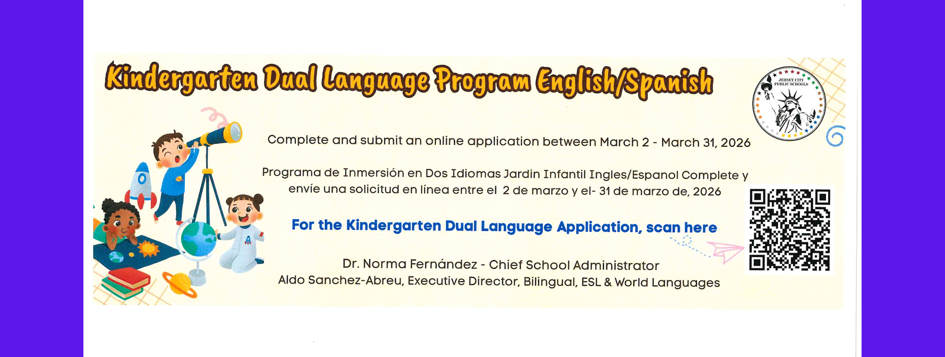 Registration open for Kindergarten Dual Language 2026-27. Applications are being accepted now through March 31, 2026.